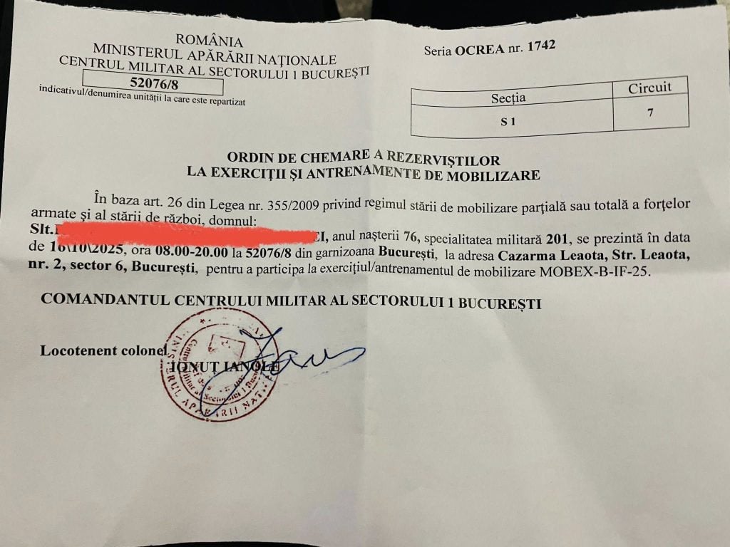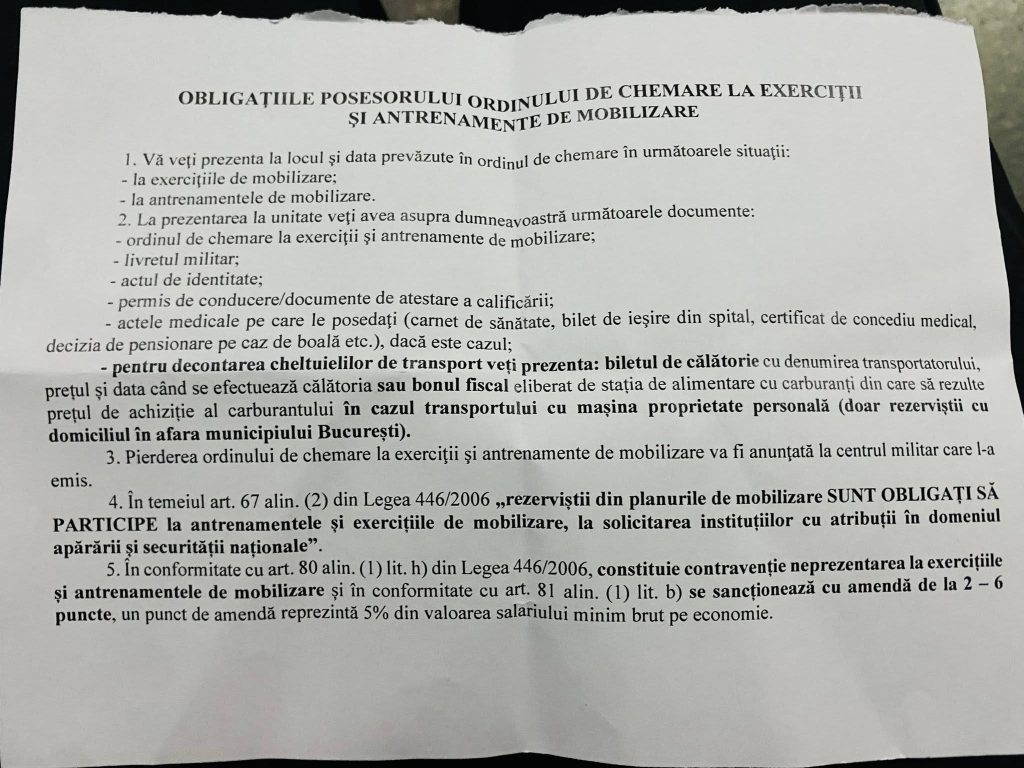 Ministerul Apărării Naționale a declanșat un exercițiu de mobilizare a rezerviștilor din București și Ilfov. Mii de persoane care au făcut armata înainte de anul 2004 sunt chemate, în aceste zile, pentru o zi de instrucție și evaluare. Exercițiul de rutină are ca scop actualizarea bazei de date a ministerului și verificarea stării de pregătire a foștilor militari. Printre cei care au primit ordinul de chemare se numără și Andrei Roșu, fostul solist al trupei „Gaz pe foc”.