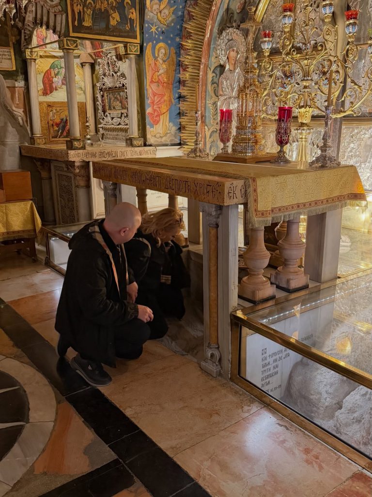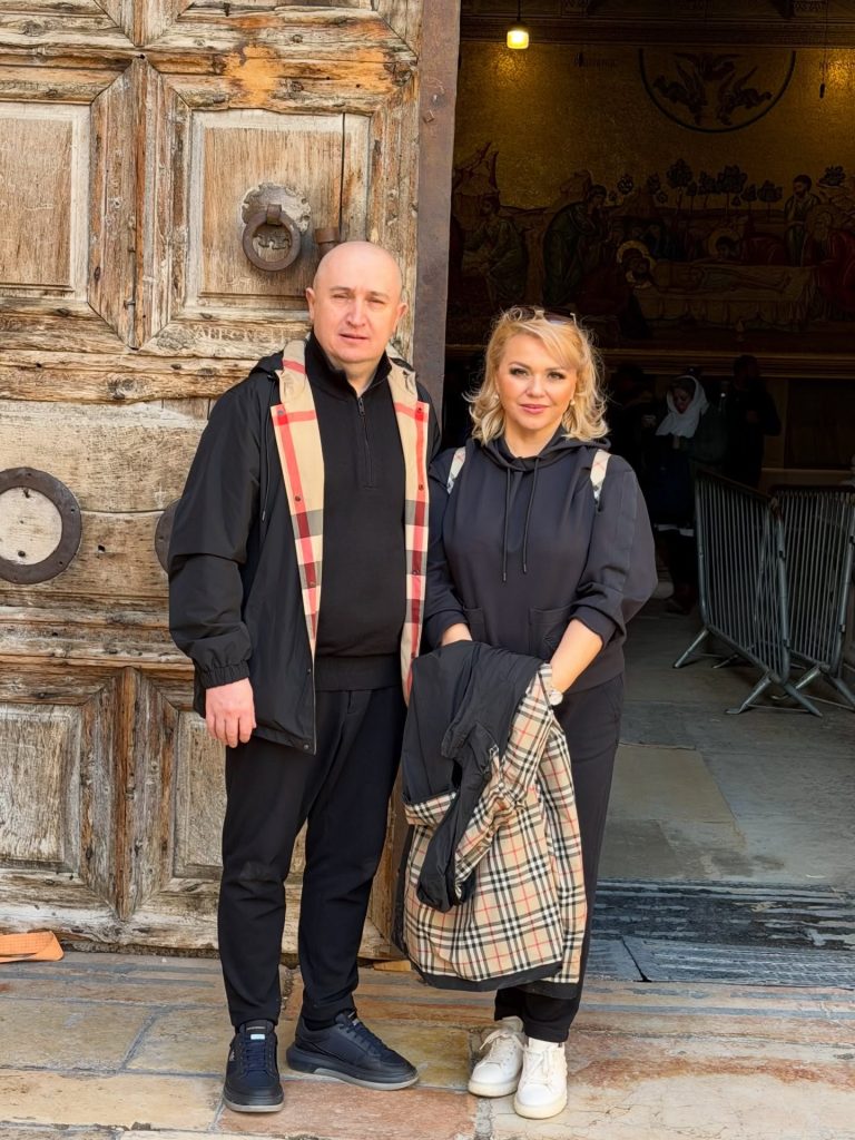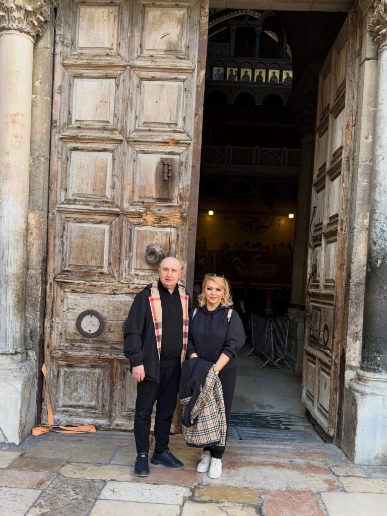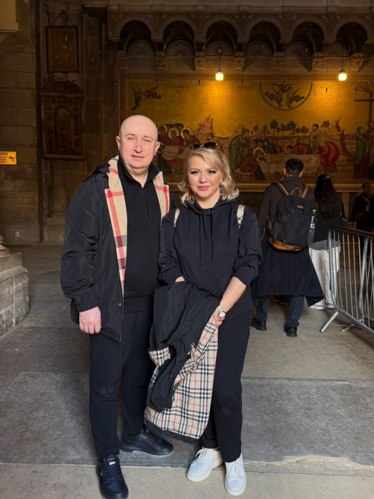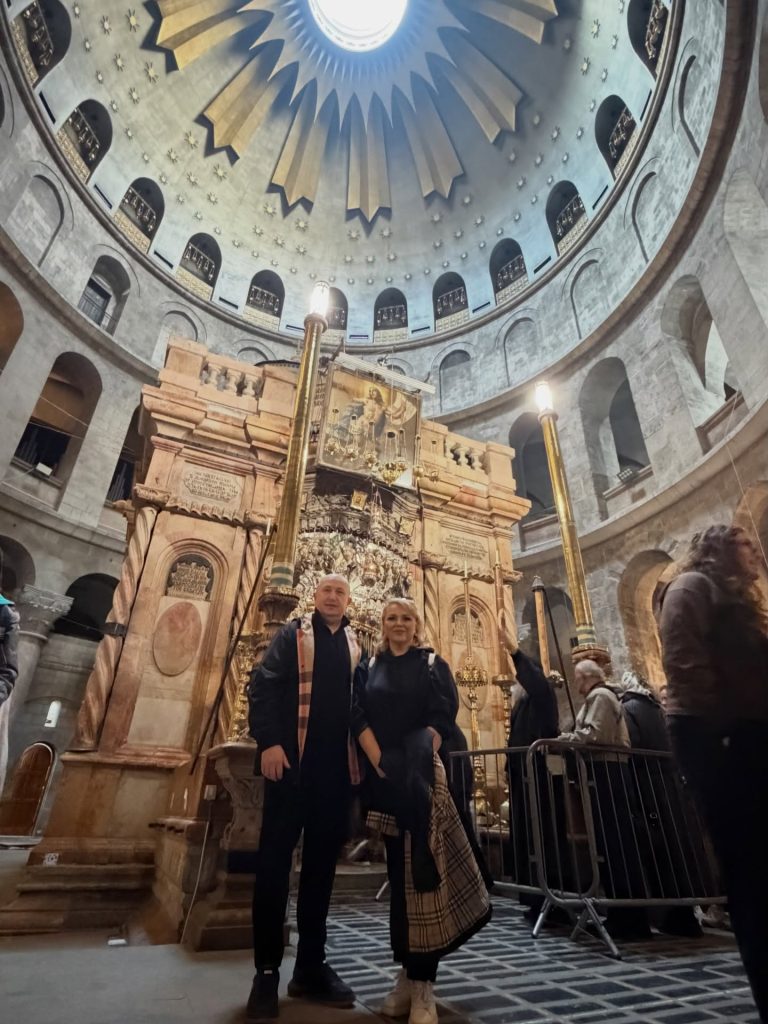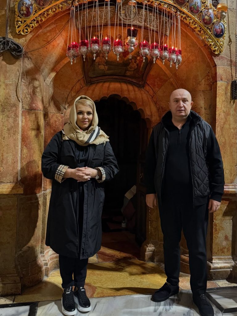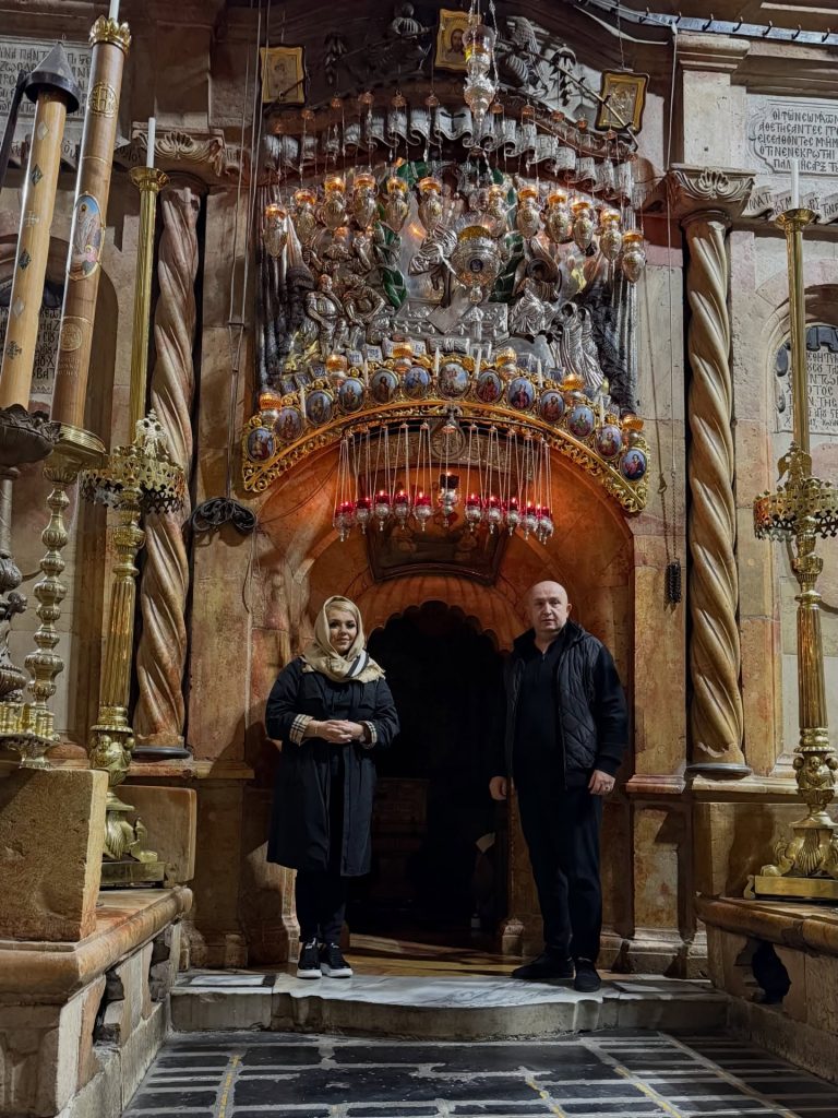 Pe parcursul pelerinajului, Cornelia și Lupu Rednic au ajuns și la Mormântul Sfânt, unul dintre cele mai importante locuri de pelerinaj pentru creștini. Acolo s-au fotografiat, vizibil emoționați, într-un cadru solemn și impresionant. În imaginile surprinse la fața locului, cei doi apar în interiorul lăcașului sacru, înconjurați de detalii aurite, candele și elemente religioase specifice. Cornelia poartă o ținută sobră, închisă la culoare, potrivită momentului, iar Lupu îi este alături, ambii având o expresie calmă și profundă, care trădează respectul și emoția trăite în acel loc sfânt.