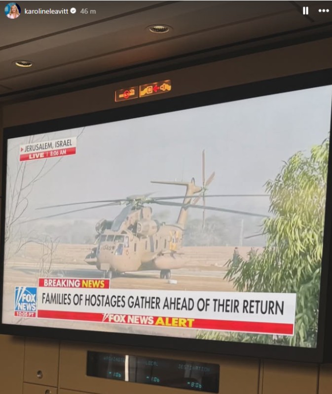 Fotografia surprinde relatările în direct ale știrilor despre eliberarea ostaticilor, în timp ce avionul prezidențial american se pregătește să aterizeze în Israel. Leavitt a însoțit imaginea cu mesajul: „istoria se scrie”.