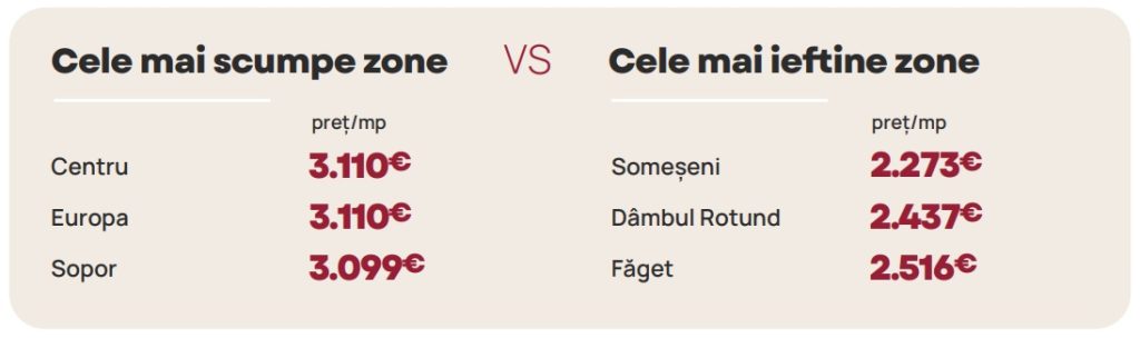 Spre comparație, în centrul orașului Cluj-Napoca locuințele se vând cu un preț mediu de 3.110 euro/mp util. Proprietarii le solicită cumpărătorilor sume similare și în cazul apartamentelor și caselor localizate în cartierul Europa. Cea mai ieftină zonă din Cluj este Someșeni. Aici, prețul mediu solicitat cumpărătorilor este de 2.273 euro/mp util.